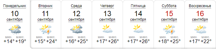 Ресурс Мeteoprog.ua прогнозирует дождь 10 и 11 сентября и температуру до +20. Затем установится сухая погода, потеплеет до +26...+27. Однако с воскресенья температура снизится до +21.