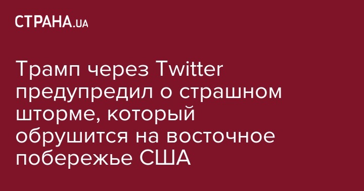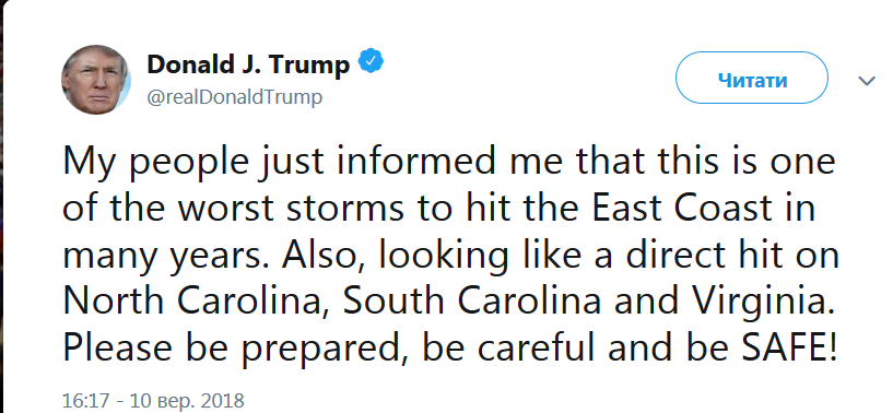 "Мои люди только что сообщили мне, что это одна из самых страшных бурь, которая ударит по Восточному побережью за многие годы. Это будет прямой удар по Северной Каролине, Южной Каролине и Вирджинии. Будьте готовы, будьте осторожны и будьте в безопасности", - написал Трамп.