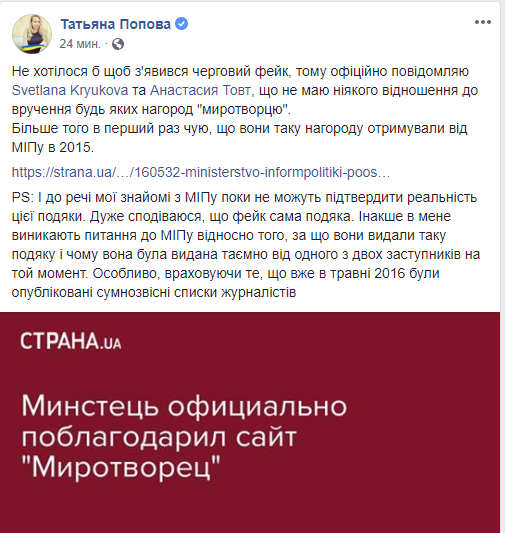 "Не хотелось бы, чтобы появился очередной фейк, поэтому официально сообщаю Svetlana Kryukova и Анастасия Товт, что не имею никакого отношения к вручению любых наград "миротворцу". Более того, в первый раз слышу, что они такую награду получали от МИПу в 2015", - написала Попова на своем официальном аккаунте в Фейсбук.