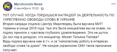 "Тот случай, когда гордишься наградой за деятельность по укреплению свободы слова в Украине. Вторая награда (подяка) Центру Миротворец была вручена МИП Украины в конце 2015 года. Чья это была инициатива мы не знаем, но подяку приняли с чувством глубокого удовлетворения. Это не шутка.