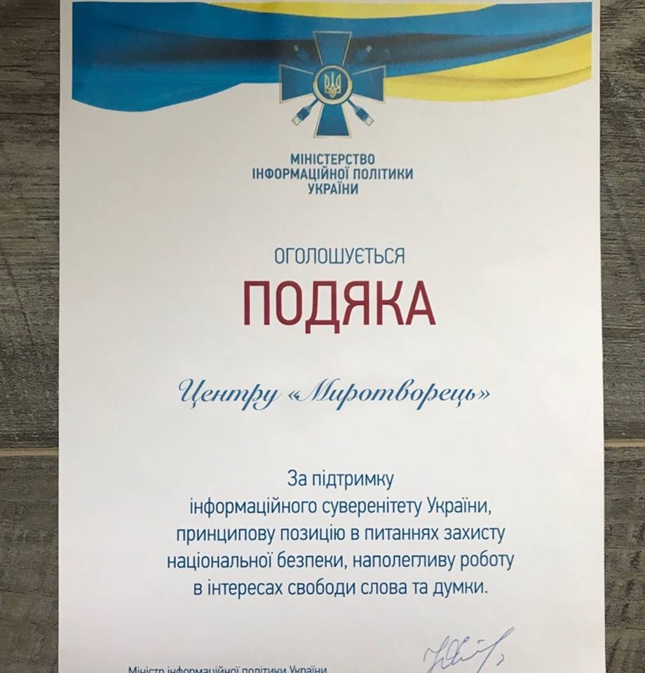 В благодарственном письме указано, что "Миротворец" награждается "за поддержку информационного суверенитета Украины, принципиальную позицию в вопросах защиты национальной безопасности и настойчивую работу в интересах свободы слова и мысли".