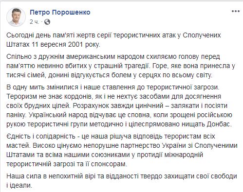 "Сегодня день памяти жертв серии террористических атак в Соединенных Штатах 11 сентября 2001 года. Вместе с дружественным американским народом склоняем голову перед памятью невинно убитых в страшной трагедии. Горе, которое она принесла в тысячи семей, до сих пор отзывается болью в сердцах по всему миру", – заявил Порошенко.