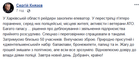 "В Харьковской области рейдеры захватили элеватор. В перестрелке пятеро раненых, среди них полицейские, местные жители, активисты и ветераны АТО. Много шума... Решение о деблокировании и освобождении предприятия принято благоразумно. Спецназ и переговорщики сработали в тандеме. Задерживаем около 50 участников. Изымаем оружие. Естественно присутствует и "джентельменский" набор: балаклавы, бронежилеты, дубинки и др. Жажду денег смешали с политикой, но всем все понятно. Восстанавливаем доверие к власти действиями полиции", - написал Сергей Князев.