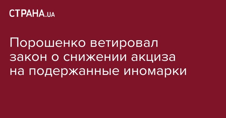 Президент Петр Порошенко наложил вето на закон, предусматривающий снижение акциза для иномарок на вторичном авторынке. Об этом на своей странице в социальной сети Facebook написал депутат Верховной Рады Владимир Парасюк.