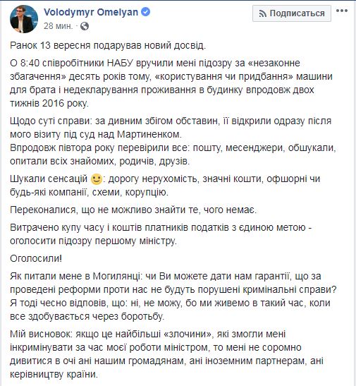 "В 8:40 сотрудники НАБУ вручили мне подозрение за "незаконное обогащение" десять лет назад, "пользование или приобретение" машины для брата и недекларирование проживания в доме в течение двух недель 2016 года.
