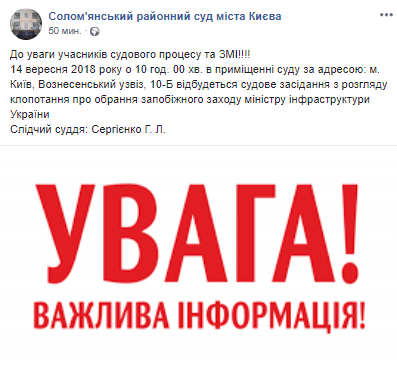"14 сентября 2018 в 10 ч. 00 мин. в помещении суда по адресу: г. Киев, Вознесенский спуск, 10-Б состоится судебное заседание по рассмотрению ходатайства об избрании меры пресечения министру инфраструктуры Украины", - идет речь в сообщении.