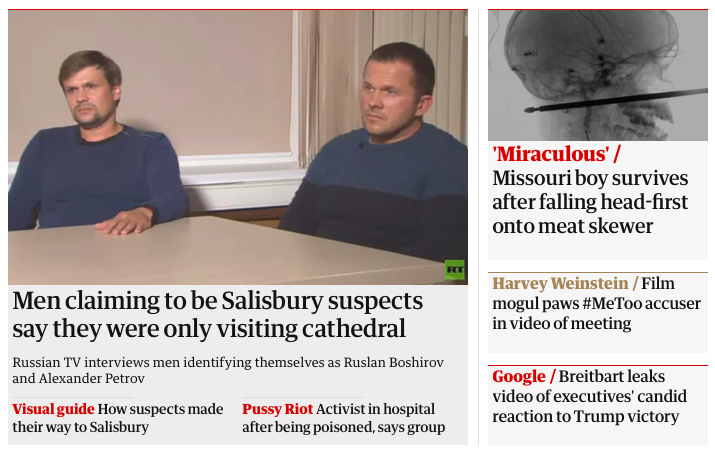 Во всех британских СМИ интервью Боширова и Петрова стало темой номер один. Они пересказывают интервью, выносят в заголовок, что россияне посещали Солсбери в туристических целях.