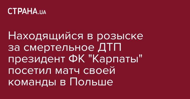 Объявленный в Украине в розыск по обвинению в совершении смертельного ДТП президент львовского ФК "Карпаты" Петр Дыминский побывал на товарищеском матче своего клуба в Польше. Об этом стало известно из соцсети Instagram, где совместное с Дыминским фото опубликовал вице-президент ФК "Карпаты" Олег Смалийчук.