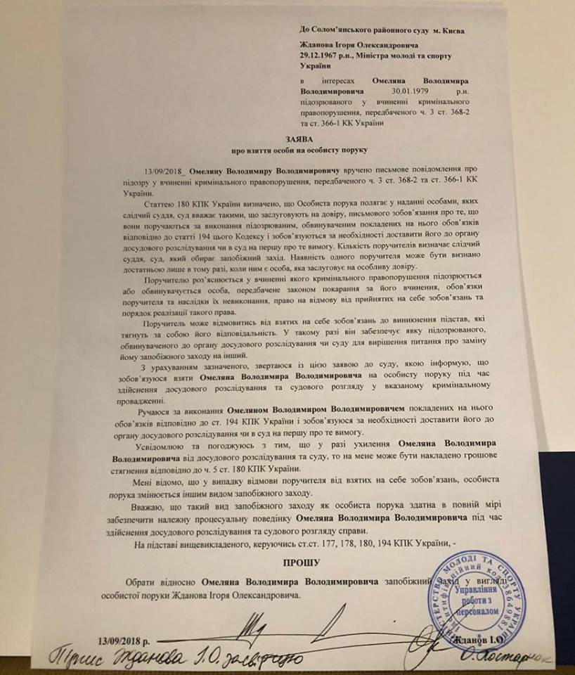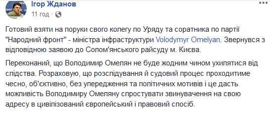 "Готов взять на поруки своего коллегу по правительству и соратника по партии "Народный фронт" - министра инфраструктуры Volodymyr Omelyan. Обратился с соответствующим заявлением в Соломенский райсуд Киева.