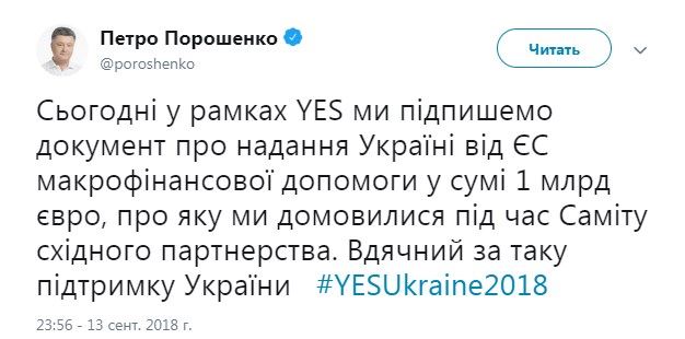 Сегодня, 14 сентября, в рамках встречи "Ялтинская европейская стратегия" состоится подписание документа о предоставлении Украине от Европейского союза макрофинансовой помощи в сумме 1 миллиард евро. Об этом президент Украины Петр Порошенко сообщил в своем Twitter-аккаунте.