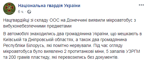 "В автомобиле находились два гражданина Украины, проживающих в Киевской и Днепровской областях, а также два гражданина Республики Беларусь, которые заметно нервничали. При осмотре микроавтобуса были обнаружены 2 противотанковые мины, 5 запалов типа "УЗРГМ" и 200 граммов пластида, которые перевозились без документов", - сообщили в Нацгвардии.