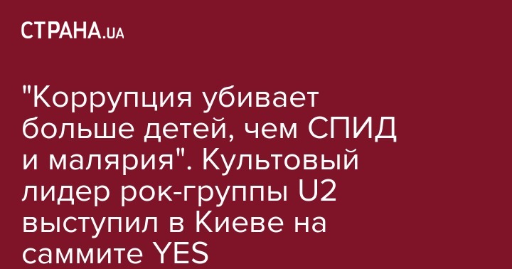 Знаменитый ирландский рок-музыкант Bono, фронтмен легендарной группы U2 заявил в Киеве, что "коррупция убивает больше детей, чем СПИД и малярия вместе взятые". Об этом он сказал в своей речи на форуме "Ялтинская европейская стратегия" (YES), передает 24 канал.