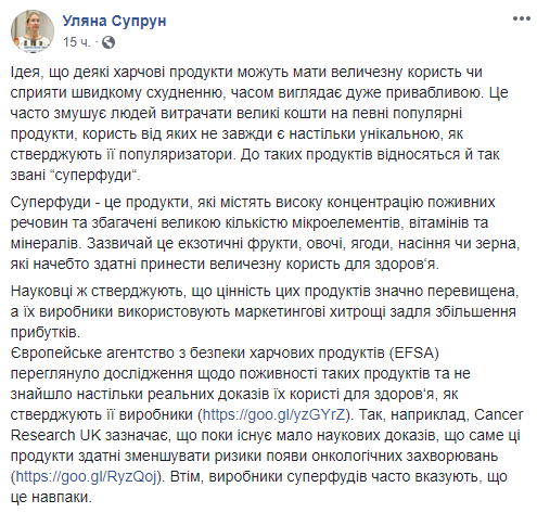 исполняющая обязанности министра здравоохранения Ульяна Супрун развенчала миф о "суперфудах". Об этом она, по традиции, написала в Facebook.