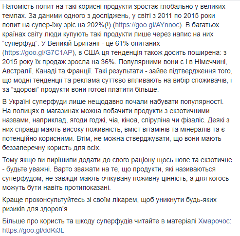 Супрун добавила, что зачастую производители используют маркетинговые уловки ради увеличения прибыли. Так, Европейское агентство по безопасности пищевых продуктов (EFSA) пересмотрело исследования по питательности таких продуктов и не нашло столь реальных доказательств их пользы для здоровья, как утверждают ее производители. Так, например, Cancer Research UK отмечает, что пока существует мало научных доказательств, что именно эти продукты способны уменьшать риски появления онкологических заболеваний. Впрочем, производители суперфудов часто указывают, что это наоборот.