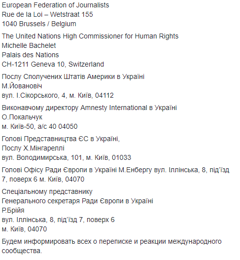 В списке значатся порядка 17 организаций, которые получат обращение о вмешательстве в журналистскую деятельность. Среди них президент Европейского Совета Дональд Туск, депатат ПАСЕ от Швейцарии Лилиан Маури Паскер, генсекретарь Совета Европы Турбьёрн Ягланд, Верховный представитель Европейского союза по иностранным делам и политике безопасности в Комиссии Юнкера Федерика Могерини, а также Репортеры без границ, комитет по защите прав журналистов и прочие инстанции.