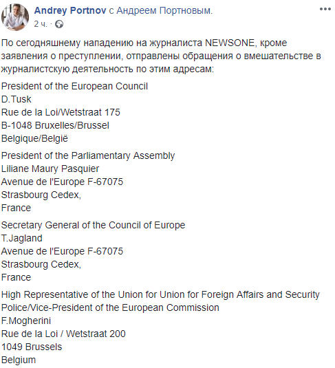 Известный юрист, правозащитник и новый управляющий канала NewsOne Андрей Портнов обратился с заявлением в международные организации после атаки на журналиста телеканала Дарину Билеру во время сегодняшнего штурма Генпрокуратуры националистами.