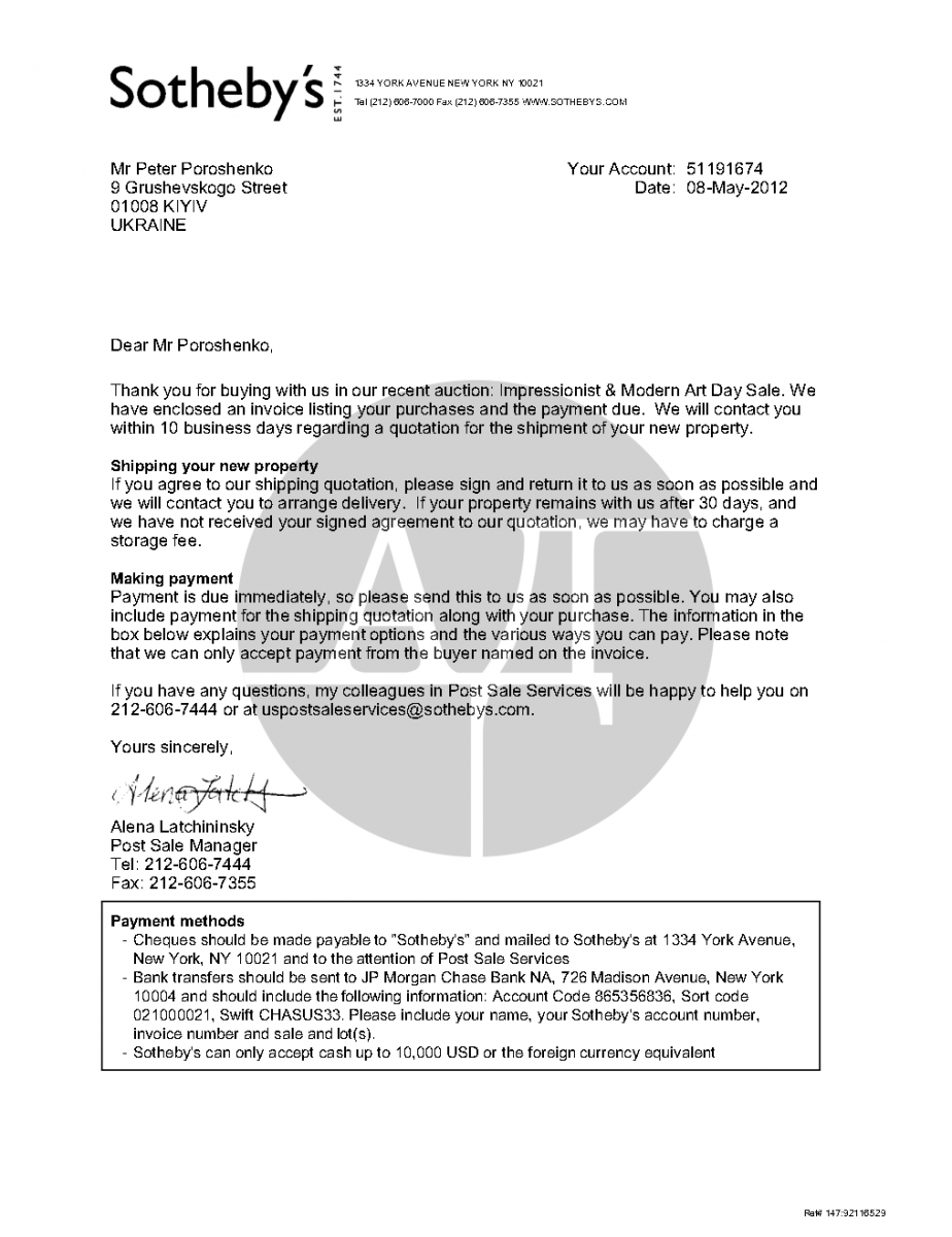 8 мая 2012 года, Алена, направила письмо Порошенко, где поблагодарила его за покупку, и приложила для оплаты данный счет (инвойс) от 4 мая 2012 года. Менеджер указала, что ждет подтверждение оплаты и в течении 10 дней свяжется с ним для осуществления доставки имущества. Если в течении 30 дней отправка не произойдет, то будет взыматься плата за хранение.