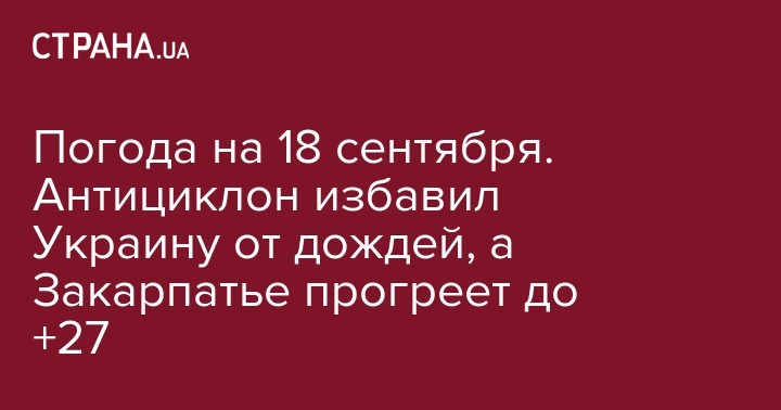 Во вторник, 18 сентября в Украине, благодаря антициклону, ожидается сухая и солнечная погода с переменной облачностью. По прогнозу Укргидрометцентра теплее всего будет на Закарпатье - до +27 градусов. Синоптики обещают также западный ветер, 3-8 м/с.