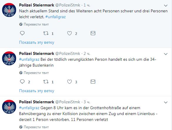Инцидент произошел около 08.00 в городе Грац на юго-востоке. Поезд и рейсовый автобус столкнулись в Граце на железнодорожном переезде на улице Гроттенхофштрасе. "К настоящему моменту погиб один человек, 11 получили ранения", — говорится в сообщении полиции.