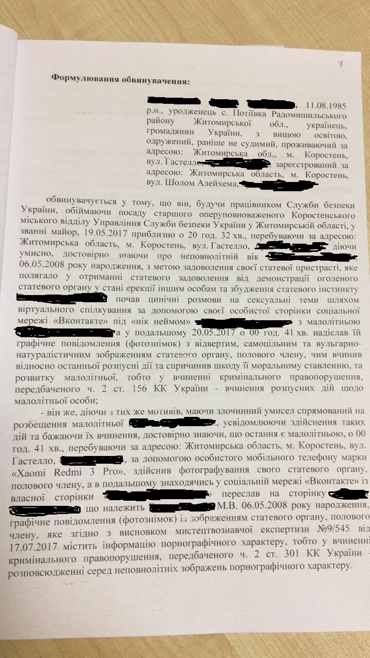 Так, согласно документу, в 2017 году старший оперуполномоченный Коростенского городского отделения Управления СБУ Житомирской области Андрей Максименко, используя фейковую страницу в запрещенной социальной сети "Вконтакте", написал несовершеннолетней девушке 2008 года рождения (девочек было не более 9 лет).