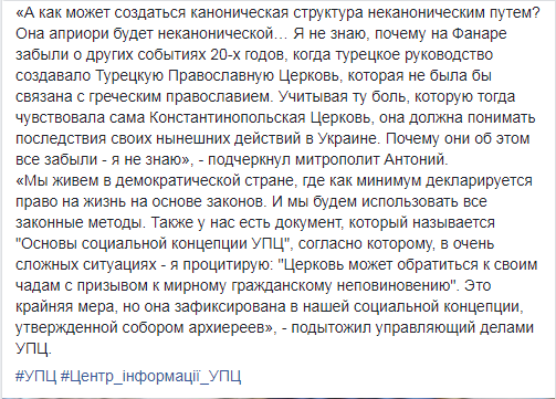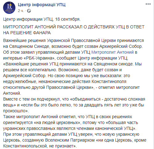 "Важнейшие решения УПЦ принимаются на Священном синоде. Мы решаем все коллегиально. Возможно, даже будет созван и Архиерейский Собор. Но свою позицию мы уже высказали: это недружелюбные, неканонические действия Константинополя относительно другой Православной Церкви", - отметил митрополит Антоний.