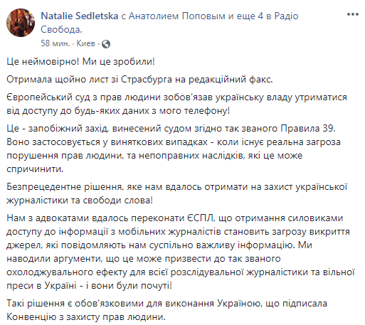 "Беспрецедентное решение, которое нам удалось получить в защиту украинской журналистики и свободы слова! Нам с адвокатами удалось убедить ЕСПЧ, что получение силовиками доступа к информации с мобильных журналистов представляет угрозу разоблачения источников, которые сообщают нам общественно важную информацию. Мы приводили аргументы, что это может привести к так называемому охлаждающему эффекту для всей расследовательской журналистики и свободной прессы в Украине - и они были услышаны! Такие решения являются обязательными для выполнения Украиной, подписавшей Конвенцию по защите прав человека", - написала она.