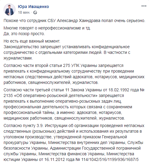 Действия сотрудника СБУ Александра Хаиндравы, который вербовал и запугивал фоторепортера "Страны" Вячеслава Селезнева, это не просто непрофессионализм и позор, это преступление. Об этом сообщил адвокат Юрий Иващенко на своей странице в Facebook.