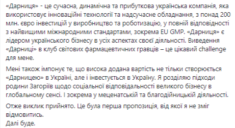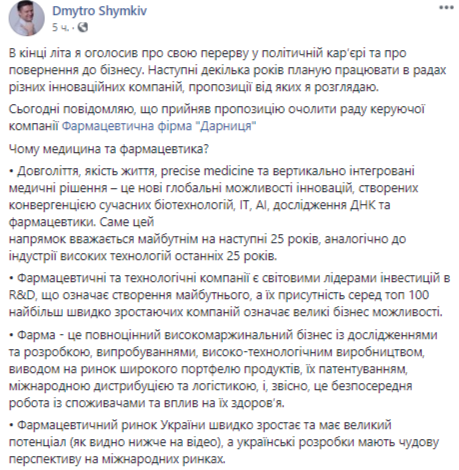 "В конце лета я объявил о своем перерыве в политической карьере и о возвращении к бизнесу. Следующие несколько лет планирую работать в советах разных инновационных компаний, предложения от которых я рассматриваю. Сегодня сообщаю, что принял предложение возглавить совет управляющей компании "Фармацевтическая фирма "Дарница", - написал он на своей странице в соцсети Facebook.