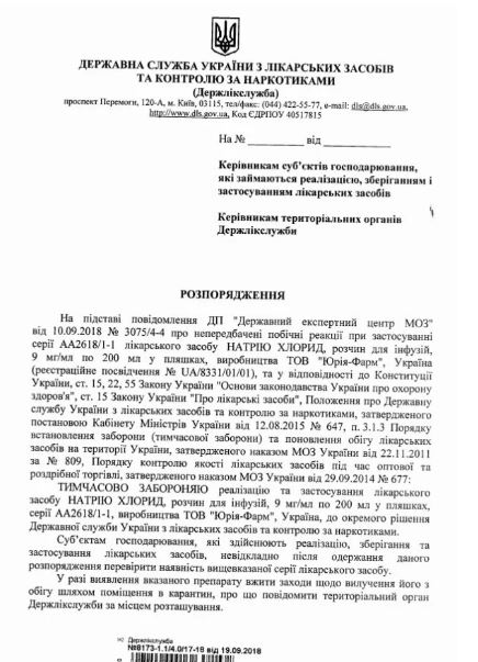Речь идет о растворе "Натрия Хлорид" серии АА2618/1-1. Производителем лекарства является ООО "Юрия-Фарм", Украина.
