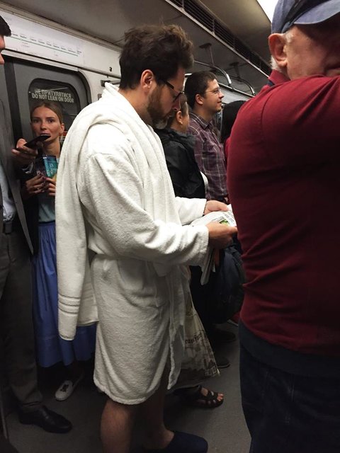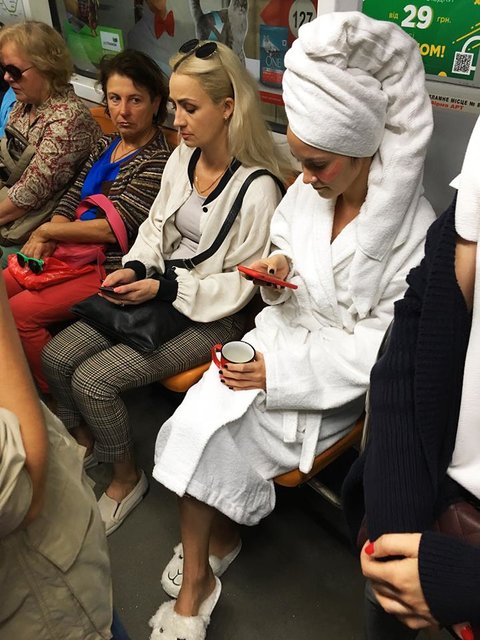 Кроме того, в метро встретили женщину в белом банном халате и с тюрбаном из полотенца на голове. Некоторые пассажиры не скрывали своего удивления, другие же старались делать вид, что не замечают странности.