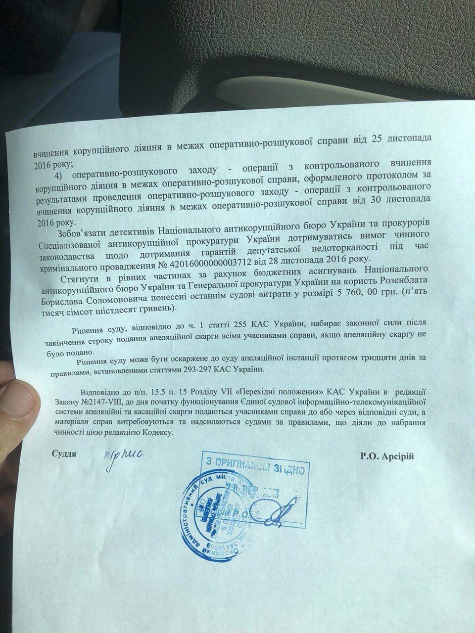 Согласно документу, признаны незаконными действия детективов НАБУ в сборе доказательной базы, в проведении оперативно-розыскных мероприятий, в том числе негласной слежки и фиксации преступления.