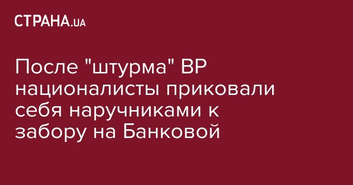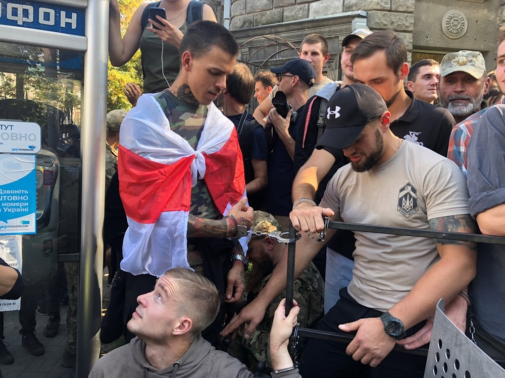 Возле здания АП события начали разворачиваться в 13:30. Среди участников акции - представители "Национальных дружин" и "Национального корпуса" с флагами партии и в футболках организации. На место стянули силовиков, которые перекрыли подход к Администрации Президента и перекрыли Банковую улицу.
