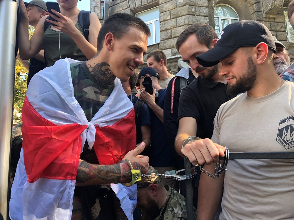 Иностранные добровольцы, защиту прав которых предусматривает законопроект, приковали себя наручниками к металлическому ограждению. Среди их требований - предоставление гражданства и легализация их нахождения в стране. В целом митингующие требуют принятие законопроекта №3433 и отставки Луценко, скандирую "Обещал - выполняй!".