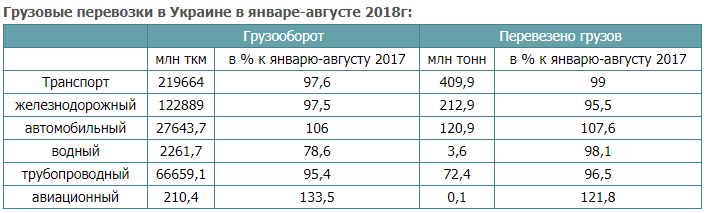 Транспортные предприятия Украины (без учета территории АР Крым и Севастополя, а также части зоны проведения ООС) в январе-августе 2018 года сократили перевозку грузов на 1% по сравнению с январем-августом 2017 года – до 409,9 млн тонн.