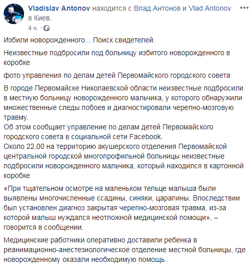 В городе Первомайск Николаевской области неизвестные подбросили в больницу избитого новорожденного мальчика в коробке. У него обнаружили множественные следы побоев и диагностировали черепно-мозговую травму.