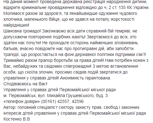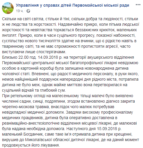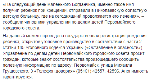 "На следующий день маленького Богданчика, именно такое имя получил ребенок при крещении, отправили в Николаевскую областную детскую больницу, где на сегодняшний продолжается его лечения", – сообщили чиновники управлении по делам детей Первомайского городского совета.
