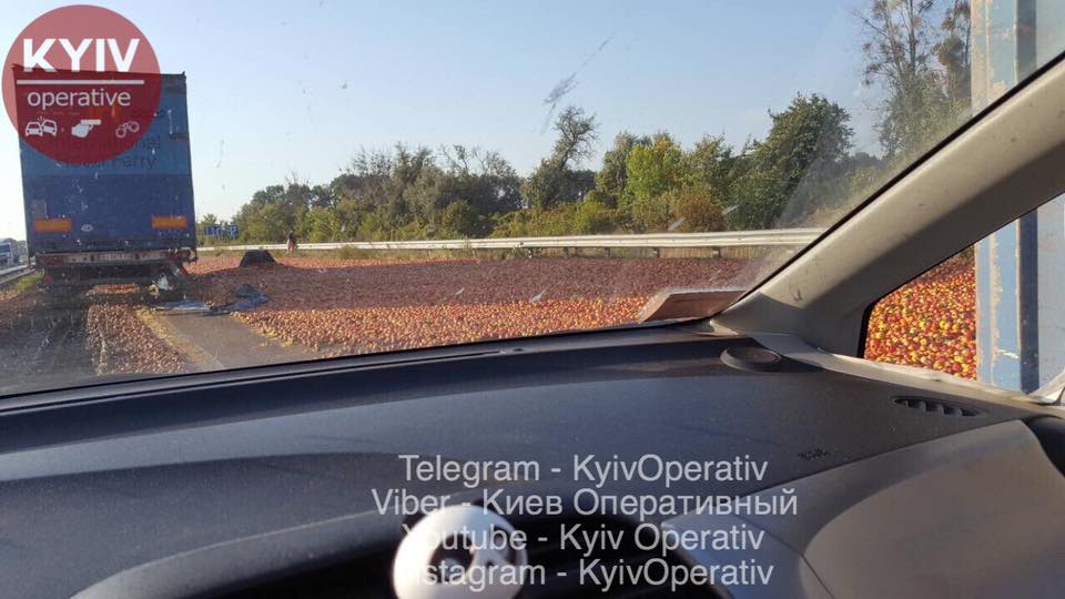 Тонны яблок усыпали дорогу. Под Киевом перевернулся грузовик с фруктами. Фото последствий