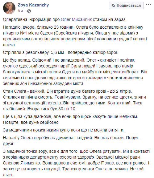 "Вчера, около 23 часов, Олег был доставлен в клиническую больницу №1 города Одессы (Еврейская больница, более у нас известная) с проникающим огнестрельным ранением левой половины грудной клетки и плеча. Стреляли из револьвера. 5,6 мм - предварительно калибр оружия. Это было нападение. Осознанное и не случайное", - написала она.