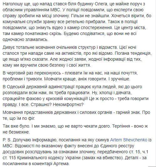 "Подчеркну еще, что нападение произошло возле дома Олега, это почти рядом с областным управлением МВД. В полиции сообщили, что эксперты свое дело сделали на месте преступления. Гильзы не нашли. Хочется верить, потому что коммунальные службы утром все тщательно убрали. Также в полиции сообщили, что снимут видео с камер наблюдения. Это центр города, там камер понатыкано везде. Будем надеяться, что они не все одновременно сломались", - добавила Казанжи.