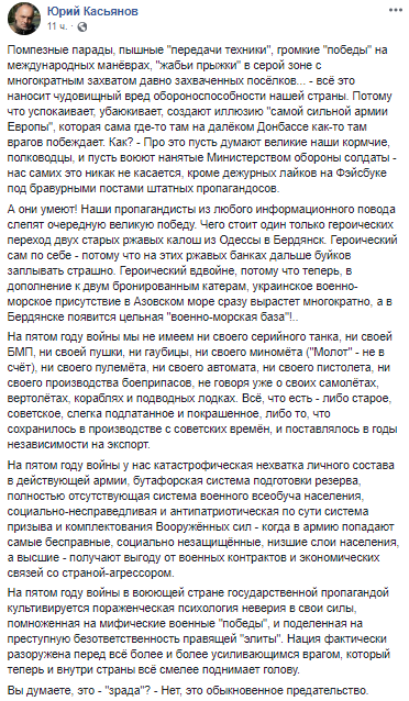 "Судя по победным реаляциям околовластной тусовки, мы здесь московитам новую Цусиму на море организовали: две старые, вспомогательные лоханки ВМС Украины успешно прошли Керченский пролив и зашли в Азовское море. Ура! Враг зассал и капитулировал перед мощью украинского буксира и плавучей Рембазы не совершив ни одного выстрела.