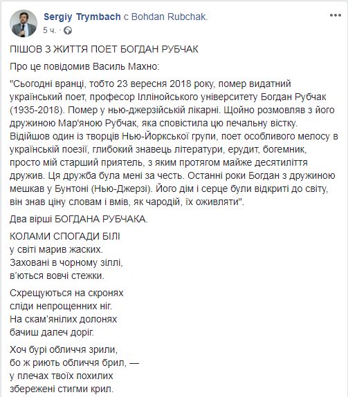 23 сентября в США умер украинский поэт Богдан Рубчак. Он являлся одним из самых известных и выдающихся поэтов диаспоры. Кроме того, Богдан Рубчак - один из сооснователей Нью-Йоркской группы. О смерти поэта на своей странице в Facebook сообщил кинокритик Сергей Трымба.