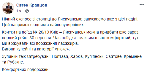 В воскресенье, 30 сентября, из Киева в Лисичанск впервые осуществит рейс ночной экспресс. Такой же, как запустили между Одессой и Львовом. Об этом сообщил исполняющий обязанности главы правления ПАО "Укрзализныця" Евгений Кравцов на своей странице в Facebook.