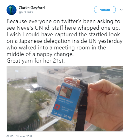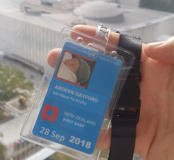 В то время как премьер-министр выступала с речью на Саммите мира памяти Нельсона Манделы, трехмесячную Неве Те Ахора держал на руках ее отец Кларк Гэйфорд. Дочь полетела в Нью-Йорк вместе с матерью, так как Ардерн продолжает кормить грудью и не может оставлять ребенка надолго.