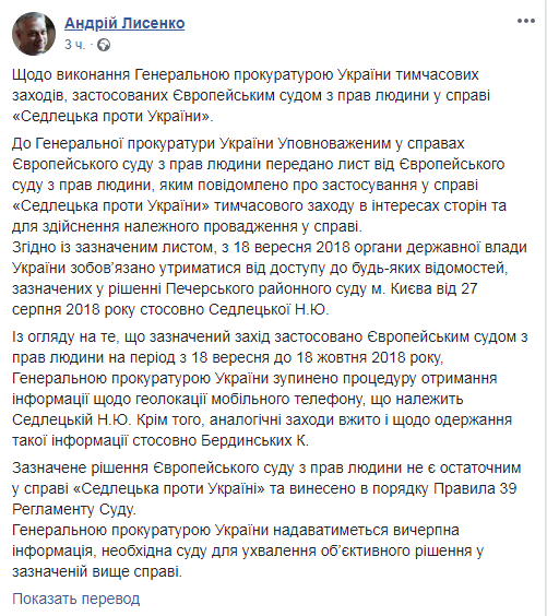 По его словам, решение ЕСПЧ принято в связи необходимостью применения неотложных временных обеспечительных мер. То есть данный вердикт не является окончательным. Мера, согласно решению суда, распространяется на период с 18 сентября по 18 октября 2018 года. На это время Генпрокуратура приостановила процедуру получения информации касаемо геолокации мобильного телефона Седлецкой и этой же информации касаемо телефона Бердинских.