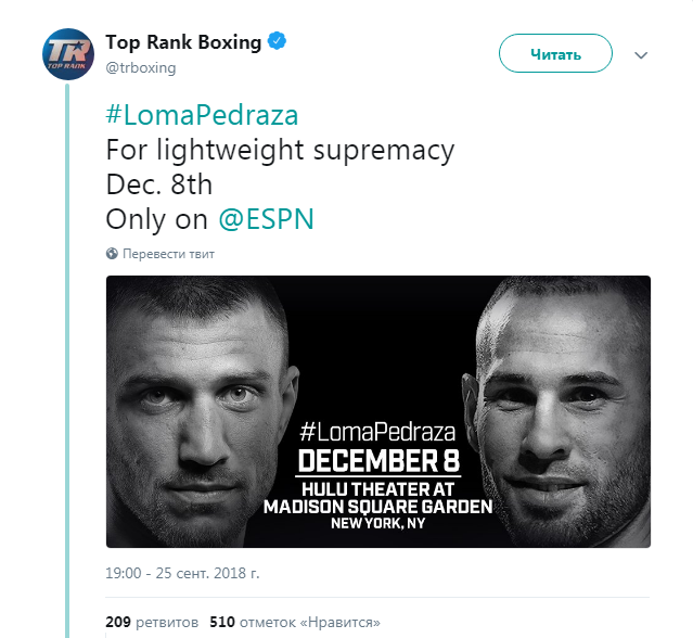 "Моей целью всегда было унифицировать титулы, и Педраса стоит у меня на пути. Есть что-то особенное в боях в Нью-Йорке и в Madison Square Garden. Фанаты в Нью-Йорке - настоящие ценители бокса, и мне не терпится показать им еще одно зрелищное выступление", - заявил Ломаченко.