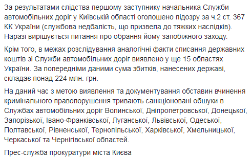 По словам Максимец, подозрение в совершении преступления 27 сентября уже объявлено первому заместителю начальника Службы автомобильных дорог в Киевской области. Его подозревают в служебной халатности, повлекшей миллионные убытки государству.