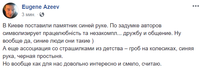 "В Киеве поставили памятник синей руке. По задумке авторов символизирует працелюбнiсть та незакомпл... дружбу и общение. Ну вообще да, синие люди они такие.