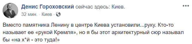Вместо памятника Ленину в центре Киева установили...руку. Кто-то называет ее "рукой Кремля", но я бы этот архитектурный сюр называл бы "на х*й - это туда!", - иронизирует блогер Денис Гороховский.