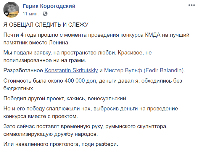 Бизнесмен Гарик Корогодский напоминает, почти 4 года прошло с момента проведения конкурса КГГА на лучший памятник вместо Ленина.