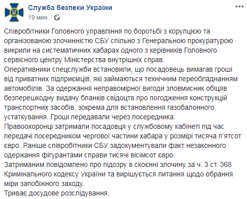 Один из руководителей Главного сервисного центра Министерства внутренних дел задержан по подозрению в систематических взятках. Операцию провели сотрудники Главного управления по борьбе с коррупцией и организованной преступностью СБУ совместно с Генеральной прокуратурой.